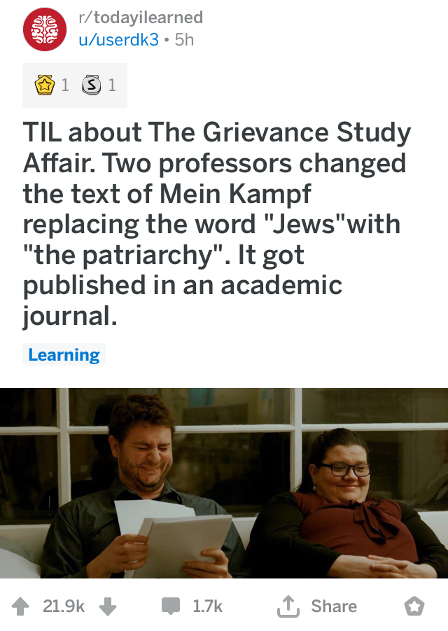>>526028071The Grievance Study Affair is hilarious. Totally demolished academia.