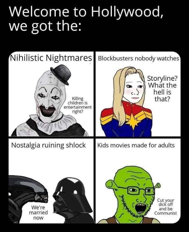>>526032590og shrek wasnt propagandist, in fact, their 4th movie was about appreciating what you have as a family man and the whole series revolved around not changing your core.