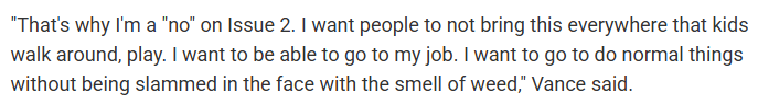 >>526035420Honestly I was for legalization because the gubbimint can fuck off, but I never actually knew what it smelled like until it happened here and now I'm starting to turn, frankly. Other post was interesting to just criminalize smoking it.
