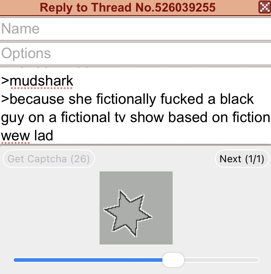 >>526047480>mudshark>because she fictionally fucked a black guy on a fictional tv show based on fictionwew ladWhy are these captchas completely kiked?