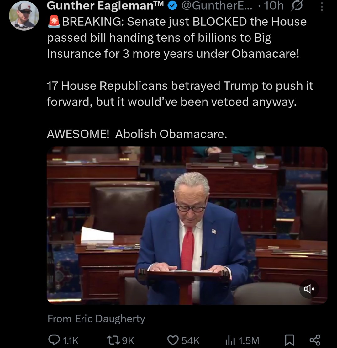 Senate apparently blocked the Obamacare funding bill so thats a small win in a sea of human feces