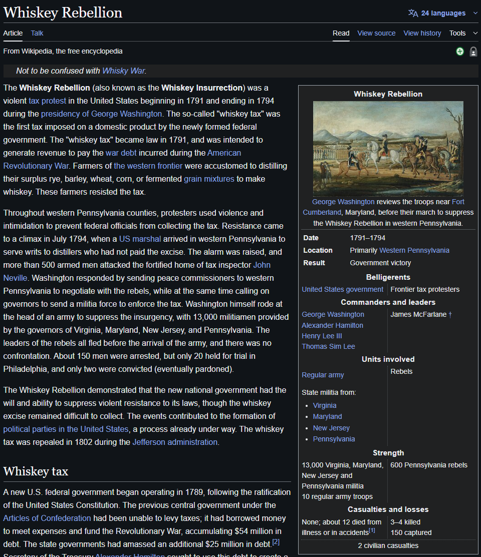>>526067092Even worse, the Whiskey Rebellion was justified, because it wasn't a tax on whiskey sales, it was a tax on production. It was the Tea Tax all over again, specifically aimed at giving certain companies a leg up over home production for personal consumption because those companies' owners were cronies with the Congressmen. It wasn't just about the whiskey tax though, it was also about no representation in government, no state or federal district courts that were convenient for those west of the Appalachians. Basically all the same complains the colonies had against Britain in the declaration. So you'd think their cause was even more legitimate than any commie bullshit that's come since.