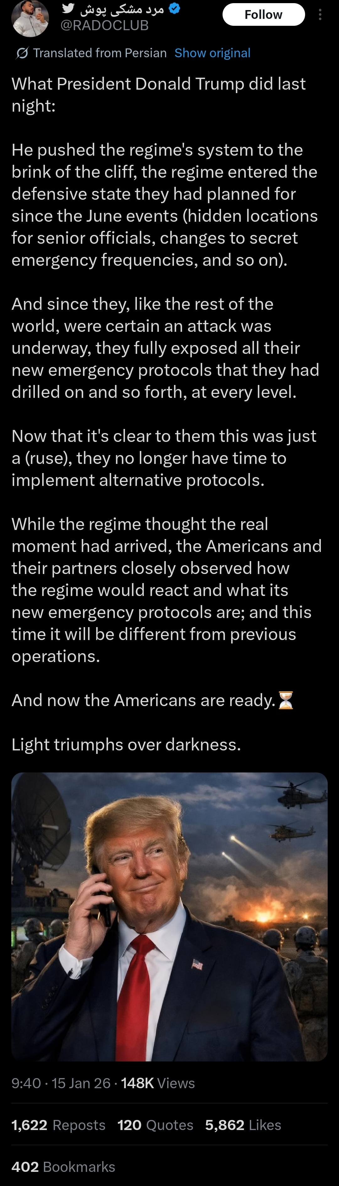 >>526070351>fake channelTrump is just buying time as they're still trying to pinpoint all the Iranian leadership. Once that's done, it's game over.