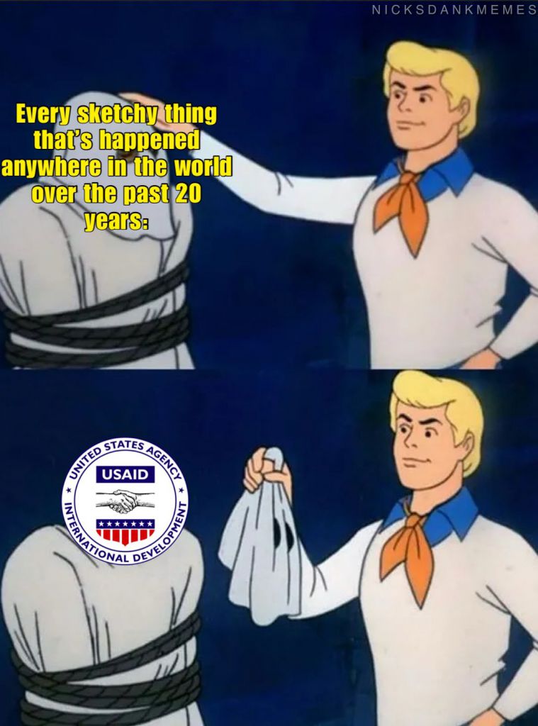 >>526078717It's hilarious how US AID became the top rightoid bogeyman out of nowhere, despite not even being a topic of discussion.Now, that nasty org framed the poor Tate mongrels, who just wanted to traffic White girls and scam people.