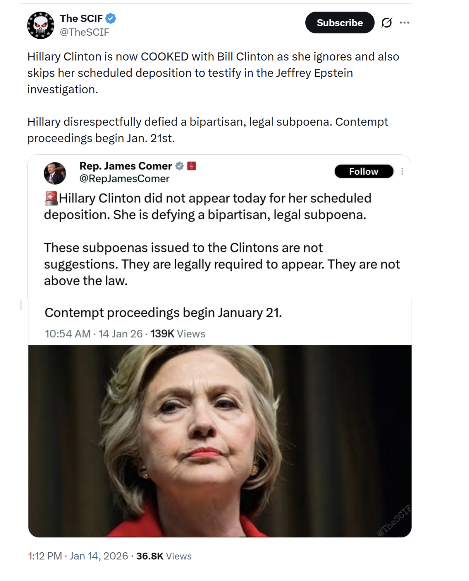 https://x.com/TheSCIF/status/2011501809878311202The Clintons have been tits-deep in treason for a long time, going back to giving the Chinese rocket technology and super computers in return for campaign cash, probably on orders from the conspiracy, going back to when it still thought it would jump into China and rule the next epoch from there. So you are going to arrest the Clintons and eventually convict them for treason and execute them. Do you wait, and let them see that coming, and maybe flee? Or might you arrest them for some fiddle-fuck shit like this, get them locked up, put them in a place where they cannot escape, and once they are locked up, reveal you are not going after them for contempt of Congress, you are going after them for treason, and you are going to kill them. Just a thought.