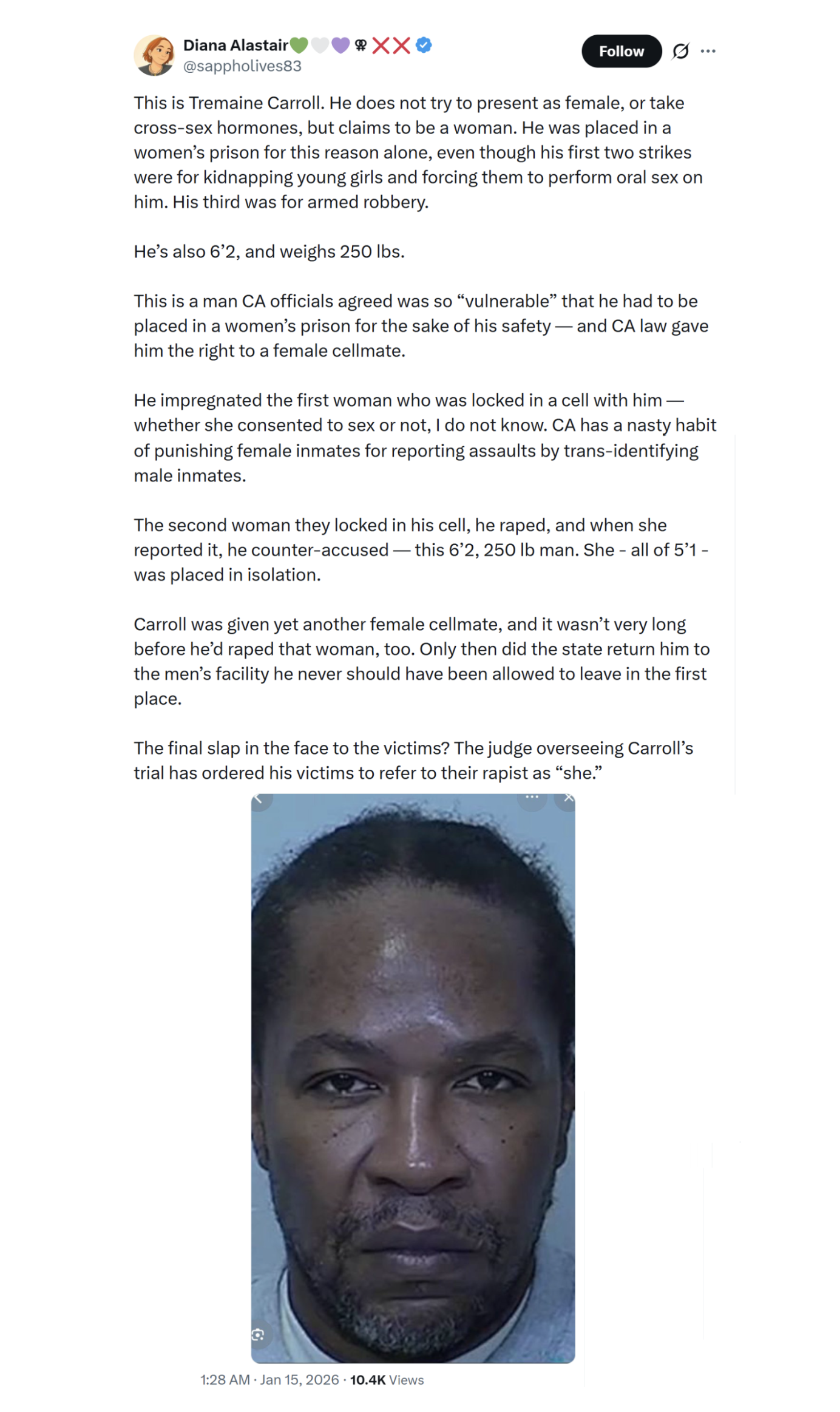 If you are in the conspiracy, I do not care if you are a soccer mom following people through grocery stores, or a Beamer pressing the button, you are responsible for this, just as if you held the girl down for him. You have decided you want, personally, whatever surveillance gives you, and if animals like this will rape women in order for you to get it, that is fine. This whole thing is evil, and any of you who want to call yourselves Americans should have had the balls to step up to it long ago.https://x.com/sappholives83/status/2011687024609157248