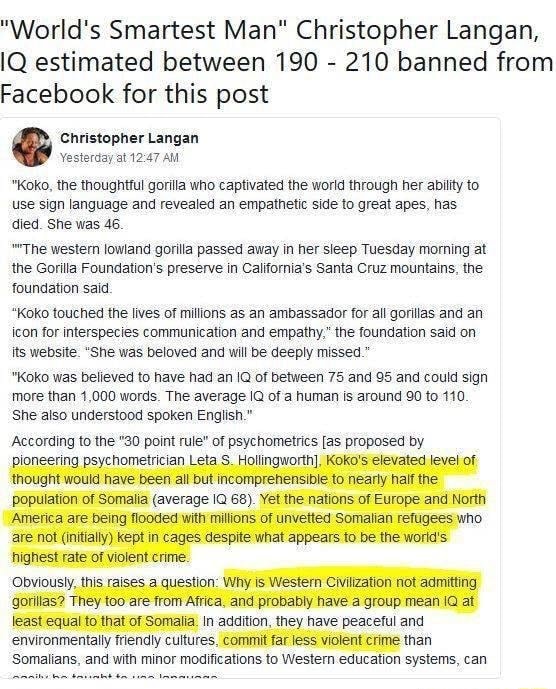 >>526102449There IQ means the average American (80-95 iq) is unable to have meaningful conversation with them. The delta in intelligence literally means they cant communicate. They shouldn't occupy a shared habitat nor internet.