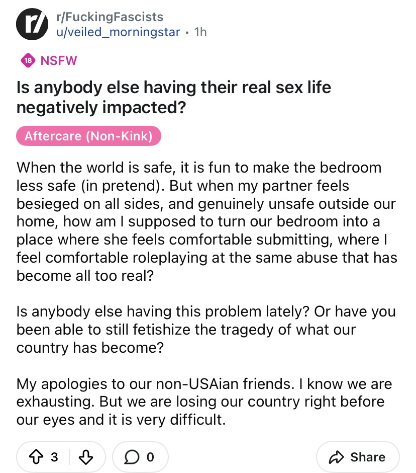 >>526105834Honestly though lol the only explanation i can see is just mental illness/social media brainrot.Would have been happier playing persona and browsing /a/ then listening to reddit and losing an eye.