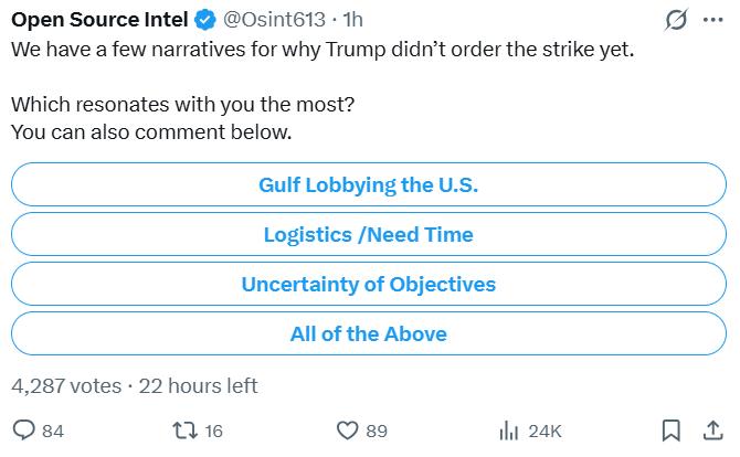 >>526107726Yeah we don't know if is an elaborate ruse or if Trump got a call from Putin, from Netanyahu, the Gulf states, the US military planners or whatever.@Osint613 has a poll offering to choose one of those options or "all of the above".