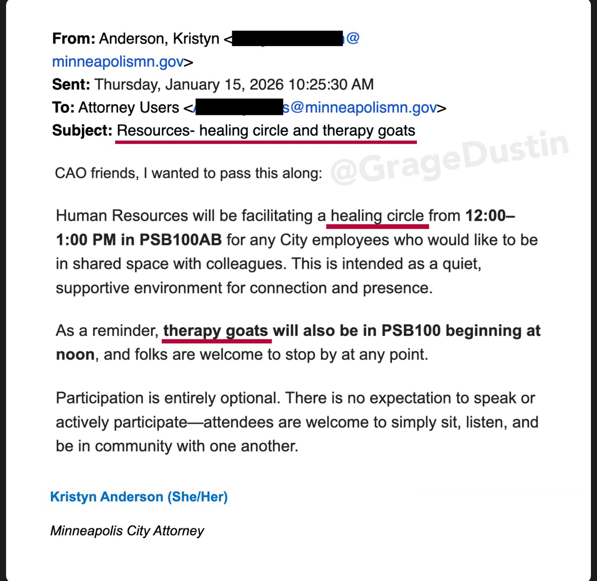 >>526116332The staff are appointed and the city attorney is elected and pardon if I don't trust the veracity of their elections>>526115063And remember thishttps://www.projectveritas.com/news/ilhan-omar-connected-cash-for-ballots-voter-fraud-scheme-corrupts-electionsSo yeah. However I am just jealous of the baby goat petting at work, let's be honestI wish I had a work baby goat I could pet at work >Tfw no baby goat to pet while eating my left over steak and onions, peppers, mushrooms and pasta