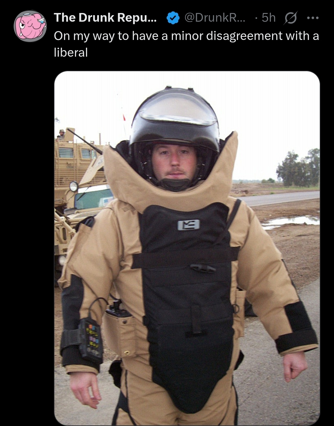 >>526118499I’ve been driving around Minneapolis wearing a plate carrier and tacticool outfits to help ICE. I don’t actually do anything. I just drive around. Lesbians spot me and follow me around honking and yelling at me. I have my windows rolled down playing this song full blast so every one within a block can hear it. https://youtu.be/rQ1NFZVEG5k?si=GykZr14oKk3rVjVm