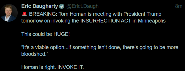 Oh hey, Tom Homan is meeting with Trump tomorrow to try and convince him to invoke the Insurrection Act. Fingers crossed.