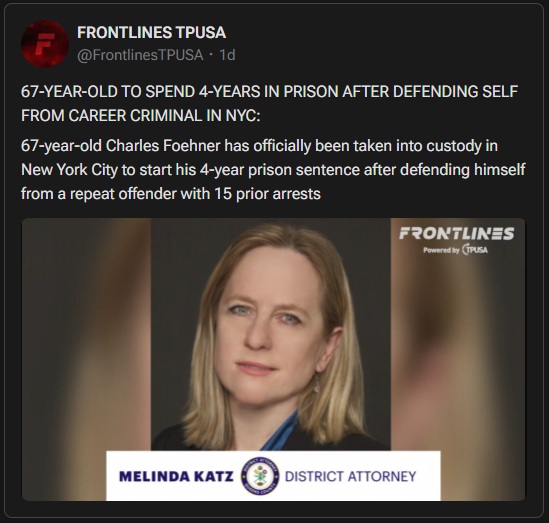 >67 year old Charles Foehner sentenced to 4 years in prison for defending himself with a gun from a 15 time career criminal in NYCGuess who the DA was that brough bullshit charges up since it was a clear case of self defense? Another white woma.He was given the option of a plea deal with 5 years prison or face a jury trial facing 25 years for owning to many unlicensed guns.