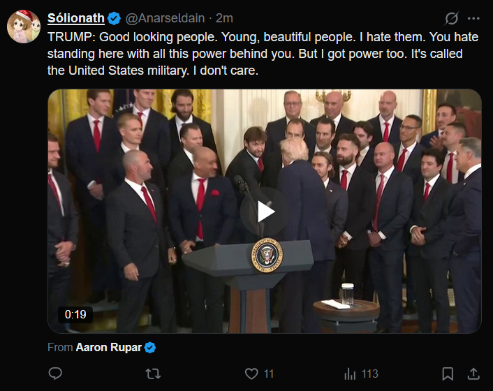 >>526122095Nothing is happening in Minneapolis. Just a bunch of millennial women and troons performatively crying at ICE from behind a fence and repetedly asking>WHO HURT YOU>>526122108Nothing ever happens so I am not getting my hopes up.