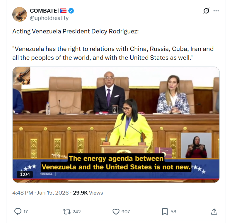 Acting Venezuela President Delcy Rodríguez:"Venezuela has the right to relations with China, Russia, Cuba, Iran and all the peoples of the world, and with the United States as well." 1/15/2026https://x.com/upholdreality/status/2011918359688790490 1/15/2026https://files.catbox.moe/qs547p.mp4
