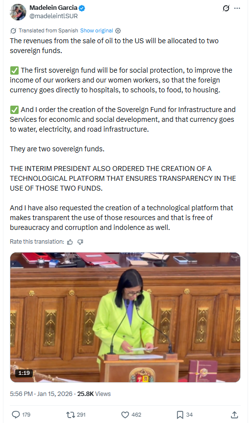 The revenues from the sale of oil to the US will be allocated to two sovereign funds. The first sovereign fund will be for social protection, to improve the income of our workers and our women workers, so that the foreign currency goes directly to hospitals, to schools, to food, to housing. And I order the creation of the Sovereign Fund for Infrastructure and Services for economic and social development, and that currency goes to water, electricity, and road infrastructure.They are two sovereign funds.THE INTERIM PRESIDENT ALSO ORDERED THE CREATION OF A TECHNOLOGICAL PLATFORM THAT ENSURES TRANSPARENCY IN THE USE OF THOSE TWO FUNDS.And I have also requested the creation of a technological platform that makes transparent the use of those resources and that is free of bureaucracy and corruption and indolence as well. 1/15/2026https://x.com/eduardomenoni/status/2011878861806715233 1/15/2026https://files.catbox.moe/4evh6y.mp4