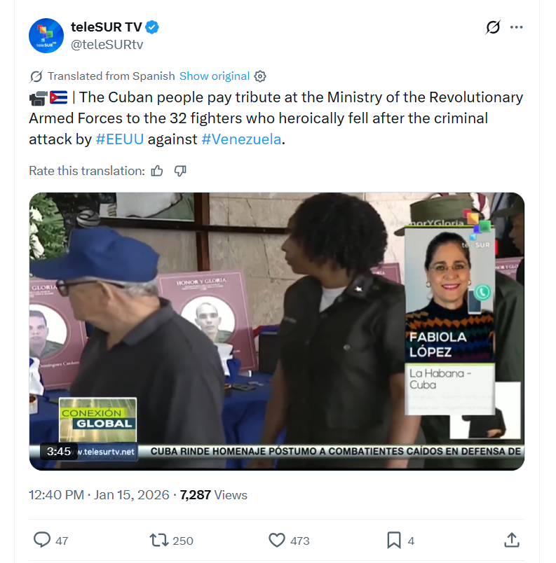 The Cuban people pay tribute at the Ministry of the Revolutionary Armed Forces to the 32 fighters who heroically fell after the criminal attack by #EEUU against #Venezuela. 1/15/2026https://x.com/teleSURtv/status/2011856036290830397 1/15/2026https://files.catbox.moe/jr1p1p.mp4