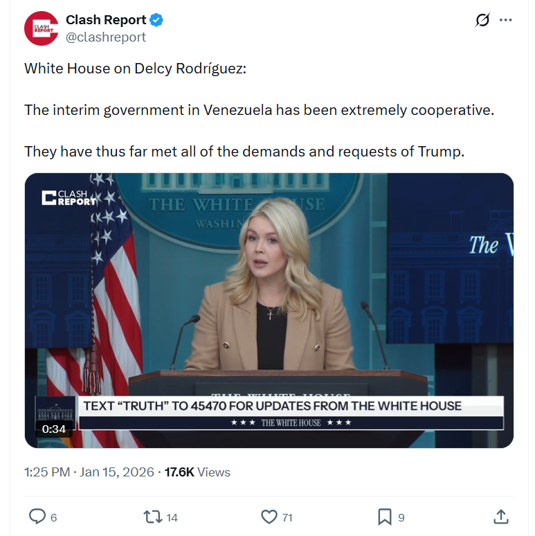 White House on Delcy Rodríguez:The interim government in Venezuela has been extremely cooperative.They have thus far met all of the demands and requests of Trump. 1/15/2026 https://x.com/clashreport/status/2011867424849629513 1/15/2026https://files.catbox.moe/uja6x0.mp4