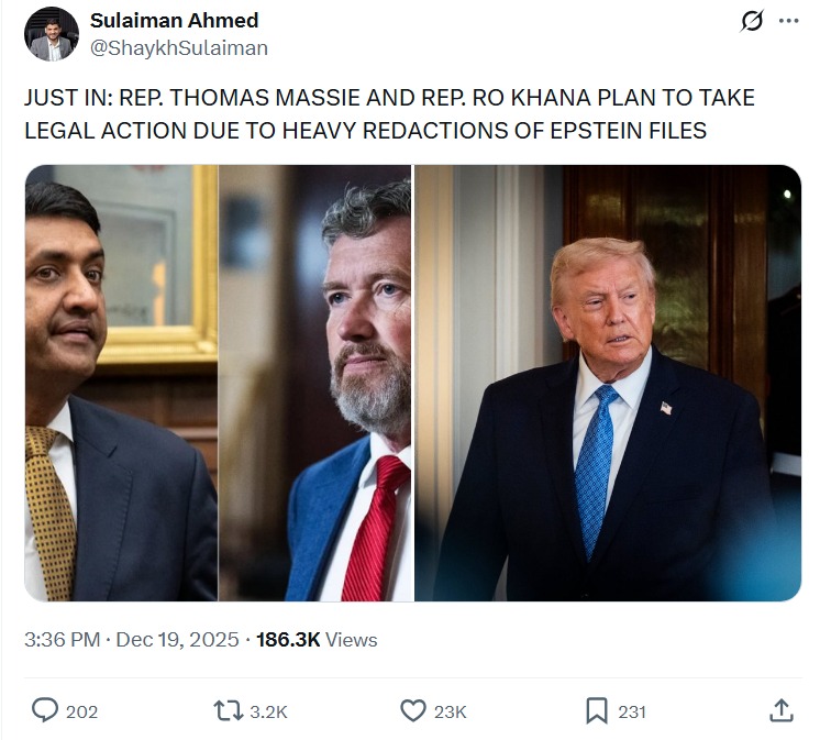 >>526136763>and could join WITH the dems to force another votetheres nothing more to vote on, it's already written into law all the files need to be released. The DOJ is currently breaking the law. Meaning, they made a calculation that releasing the files is worse than people potentially going to jail.What Massie and Khanna are doing now is requesting a federal judge to appoint a special master to force the release of the files (outside of DOJ control). If that doesnt work, Massie will bring inherent contempt charges against Pam Bondi.Regardles, since it's written law, the files are going to get forced out one way or another. It's just a matter of when.
