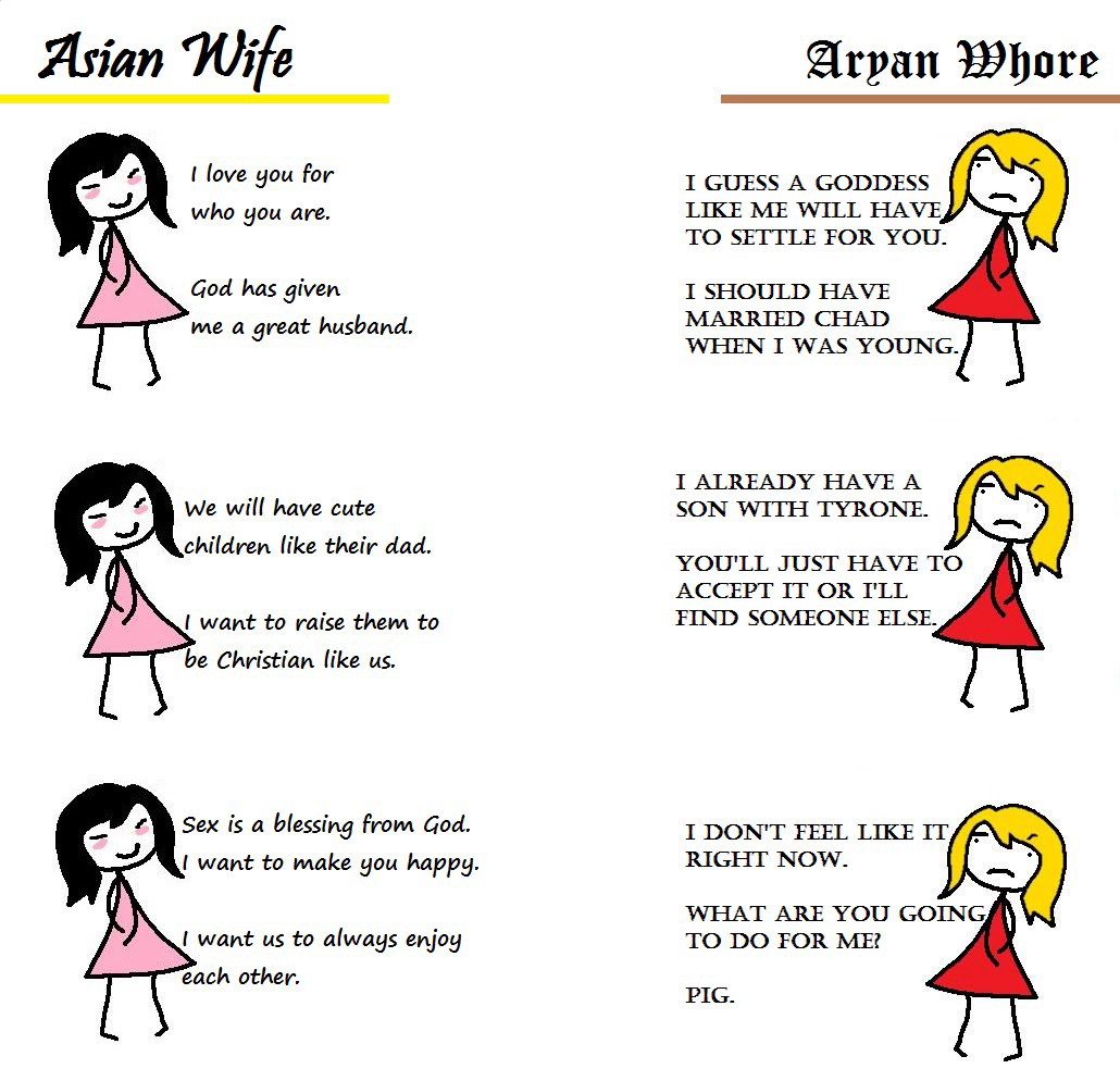 >>526140895Asian wife: >where the money? why you no make more money? >where luxury car? >why not better luxury car? >where big house? >where strong aryan son? >Y U MAKE ME UGLY ASIAN BOY white woman:>wow this weed and this hike is so amazZZZing>like i’ve never met a guy who likes hiking too >and the weed… >this is just like such a powerful beautiful moment >and i’m so happy to be able to experience it with you >OH MY GAWD YOU BROUGHT GOLDFISH YOU ARE THE MAN!!!