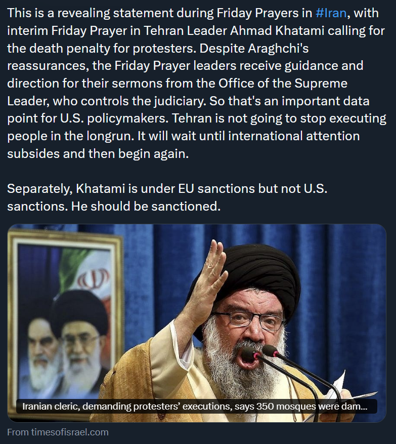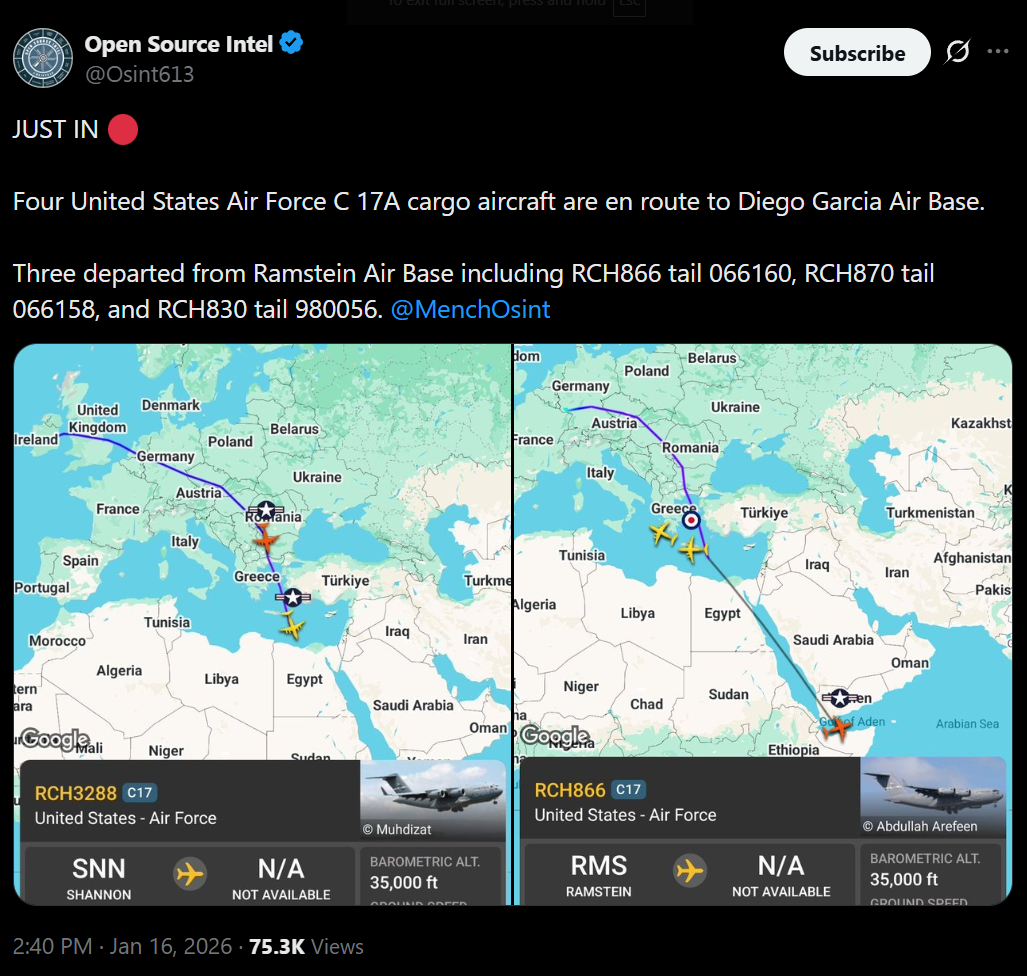 TIMELINE:Jan 14:>Iran closes its airspace>A Western official says all signals are that a "US attack on Iran is imminent" - Reuters>Martial law is in effect across Iran>US has evacuated multiple bases in the area in preperation for incoming retaliation strikes from Iran>Allegedly protesters have now been provided with weapons from abroad>Israeli media pushed an intense wave of reports within fews hours linked to a potential U.S. attack on Iran>IRGC:"Special combat teams in the streets were dismantled in 9 Iranian provinces and 31 elements who were ready to cooperate with Mossad were identified">It appears the Israeli Air Force has activated its defensive doctrine, which includes the dispersal of its air assets.Jan 13:>Trump: I have cancelled all meetings with Iranian Officials until the senseless killing of protesters STOPS. HELP IS ON ITS WAY. MIGA... PRESIDENT DONALD J. TRUMP>China, USA calls for it's citizens to evacuate from Iran. More countries suddenly follows.>MASS PUBLIC EXECUTIONS SET FOR TOMORROW ACROSS THE NATIONJan 12 and before:>Heavy govt crackdown in Isfahan, live ammunition being used - FOX>every major city has or is experiencing protests>estimated thousands of protestors dead, unverified source says over 20k likely dead>dozens of police dead during clashes, Islamic regime using machine guns to surpress crowds>complete network blackout cell/internet>Govt is cracking down on satellites and starlink terminals.