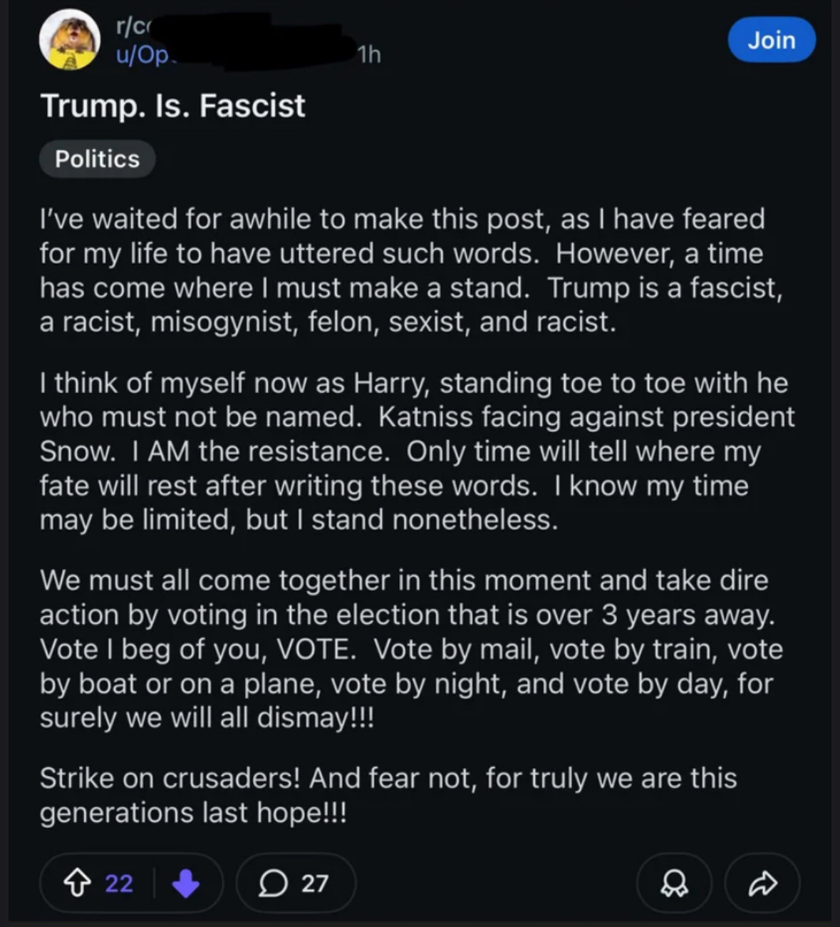 Posts like this have me convinced that we can't let the Democrats win any elections anymore. They basically tell us that as soon as they have power they will slit our throats, so we better slit their throats now so they can't seek revenge in 3 years.