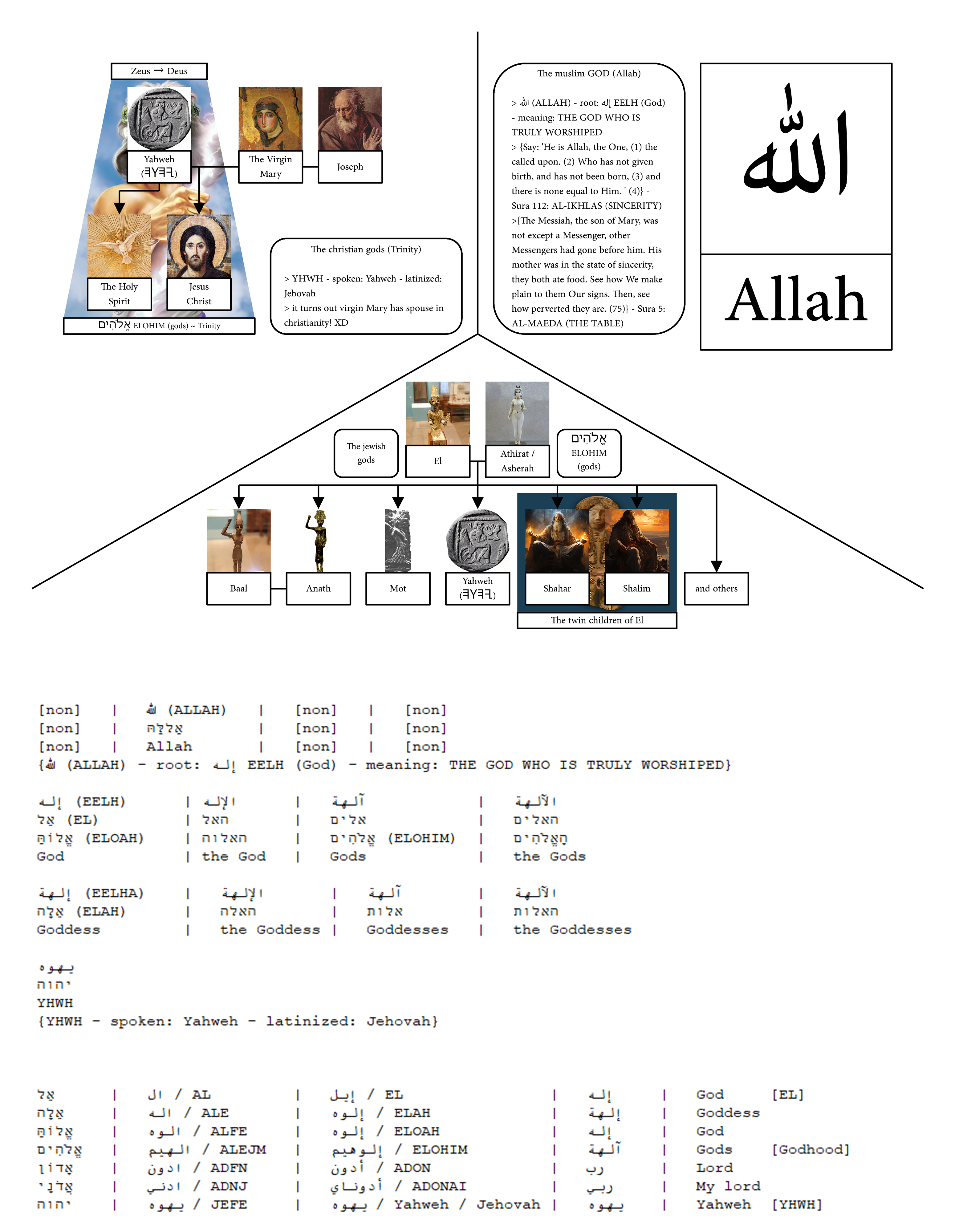 >>526158853in protosemitic Al/EL/Il إلin hebrew ELoh (ELohim literally means GodS) إلوهin Aramiac and Arabic ELah / Lah إله AL-LAH الله literally means "THE-God" islami is EL-totalism and you are a shit turk who never studied any of this maybe dont even speak any semitic language