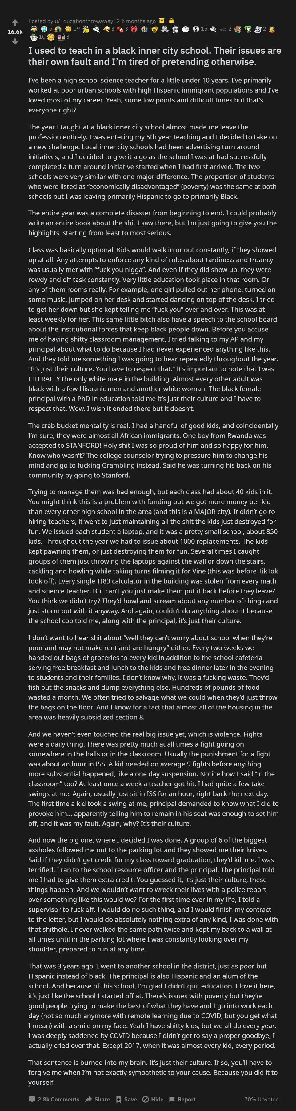 >>526161666THIS ISNT ANYTHING FUCKING NEW.Im 42. When I was in school, three quarters of the kids in ALL the schools I went to could barely read. "No child left behind" became a thing, and they dropped the required grade to pass from a C+ to a D- right at the end of highschool. It went down progressively. In elementary it became a C-, then a D in middle school, then a D- in HS. In my elementary school, they introduced "creative spelling" and near the end of it "creative math", both meant if the kid "tried" to do it, tried REALLY HARD, it was acceptable. This was all in the late 80s and throughout the 90s. No one had computers, no one had internet, no one had cell phones, let alone smart phones. This was all in michigan, but I know for a fact it was in florida as well because my family went there once a year and I had friends there. This shit has been going on for a LONG fucking time.