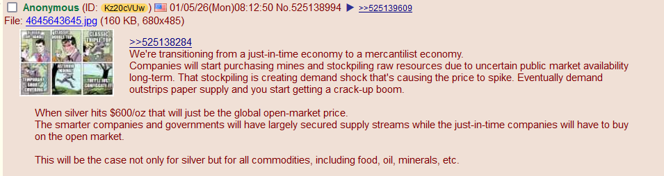 >>526167401it's nowhere near real value yet, they only pull 15oz of silver out of the ground for every 1oz of gold and silver is consumed far more. the 80s peak was due to paper manipulation driving the price down. the opposite is happening now where CME is trying to use paper to keep the price down and is failing because there's a supply crunch.