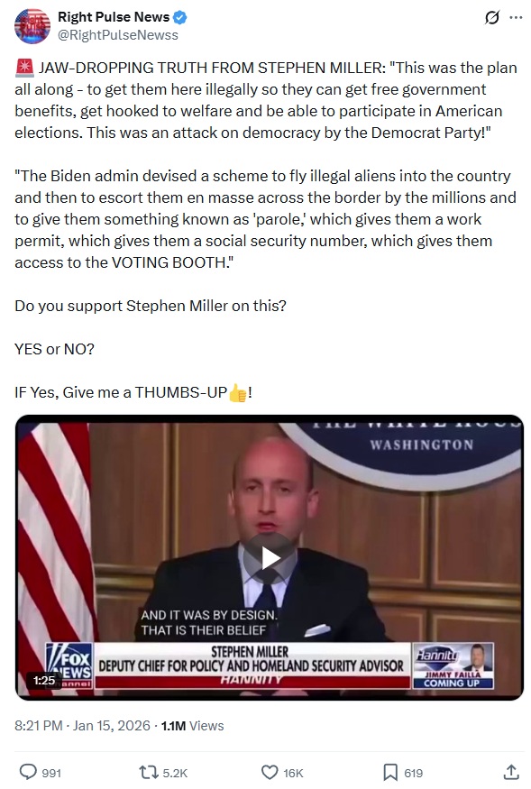 >t-they're breaking the law!THEN DO SOMETHING ABOUT IT. YOU CONTROL THE PRESIDENCY, THE SENATE, AND THE HOUSE. FUCKING DO SOMETHING AND STOP VIRTUE SIGNALLING HOLY FUCK.https://x.com/RightPulseNewss/status/2011972048437031168