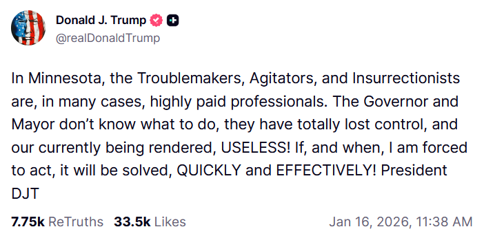 https://x.com/WarClandestine/status/2012233176874098812so pretty much trump will do the insurrection act, just waiting a little bit longer, my guess is he knows the leftists will do another dumb ass attack on ICE and when that happens he will press the button