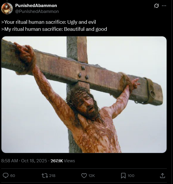 >>526177514>Your ritual human sacrifice: Ugly and evil>My ritual human sacrifice: Beautiful and goodCompletely different, Jesus Christ took it upon himself willingly to bear the punishment and penalty for mankind's sins plus he was primarily executed by the jewish leadership to try and shut him up since Jesus was calling them out every second of the day about their wicked ways. He didn't just nail himself to the cross and that was it like that twitter fag is implying. Human sacrifice throughout human history historically has been forcing people (children and prisoners) into a fire, leaving them somewhere to starve/drown, or carving their heart out with a knife, beheading them, and kicking them down a pyramid structure. Imagine trying to compare the sacrifice of Jesus Christ which was done for the benefit of US plus mainly happened because the jewish elders conspired to kill him to human sacrifice brutally done to people against their will to appease some lake god or god of the crop harvest.