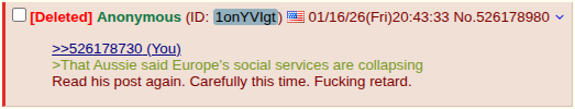 >>526178452Huh? That Aussie said Europe's social services are collapsing under shitskins which you'd know to be true if you lived here. Why did an American then reply as if the Aussie was talking about the US? Is this bot broken?