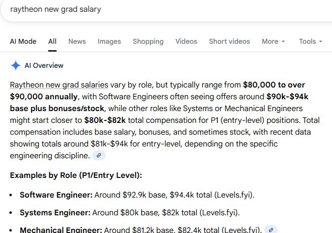 >>526177758I worked for Raytheon when I first graduated as a Systems Engineer (ME degree though). I started at 60k in 2012. I kept in touch with people though and during covid, the market went crazy. STEM starting engineers is absolutely around 90k (in the defense sector) and at RTX specifically. I am now at 200k at a different company, but I did fast track a bit because skills.