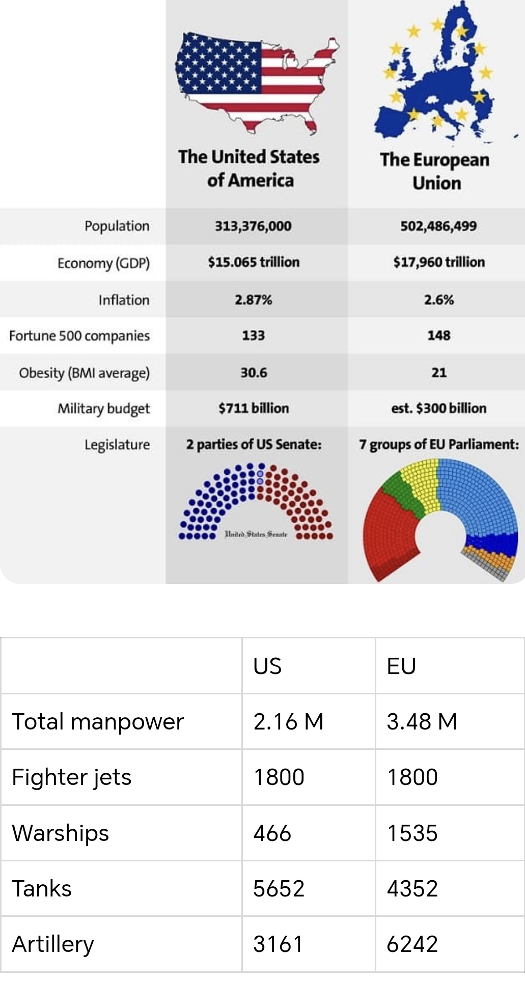 >>526178628Ok, GDP is around 30 trillion in both US and EU, but EU still has much larger population and inflation rate is now 2.1% in Europe. BMI is the same in Europe, not sure what it is in the US but they for sure are only getting fatter. Senate vs Parliament still the same. Everyone knows the US military budget is a giant ponzi scheme and a money laundering operation. Military strenght is accurate for today.
