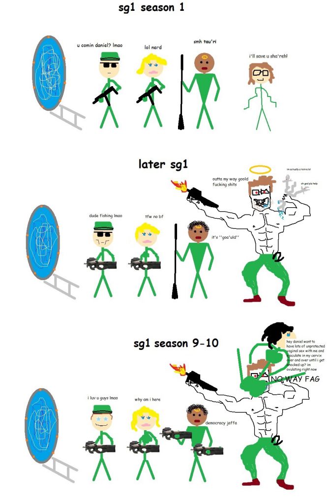 >>526187599>comfy late 90s early 2000s show based on 90s movie>'murica fuck yea >archeology, history, mythology>exploration, action, sexy women>plots build on each episode>so many episodes, 45 minutes eachBasically, the plot is the great bronze age civilizations were run by an intelligent race of aliens that used humans as a host which were the gods of those cultures. They traveled around the galaxy using the stargate, and we found one that was buried after we kicked them out then started exploring. One of the greatest sci-fi shows of all time. >>526187651yea well you suck