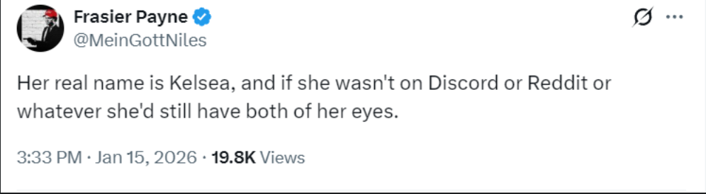 >>526189999>if she wasn't on Discord or Reddit or whatever she'd have both of her eyeslmao so trueTrump needs to target these pedo platforms