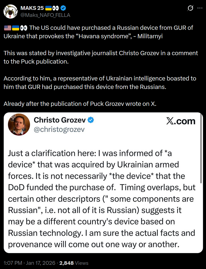>The US could have purchased a Russian device from GUR of Ukraine that provokes the “Havana syndrome”, - Militarnyi>This was stated by investigative journalist Christo Grozev in a comment to the Puck publication.>According to him, a representative of Ukrainian intelligence boasted to him that GUR had purchased this device from the Russians.>Already after the publication of Puck Grozev wrote on X.mystery device, a new wunderwaffen