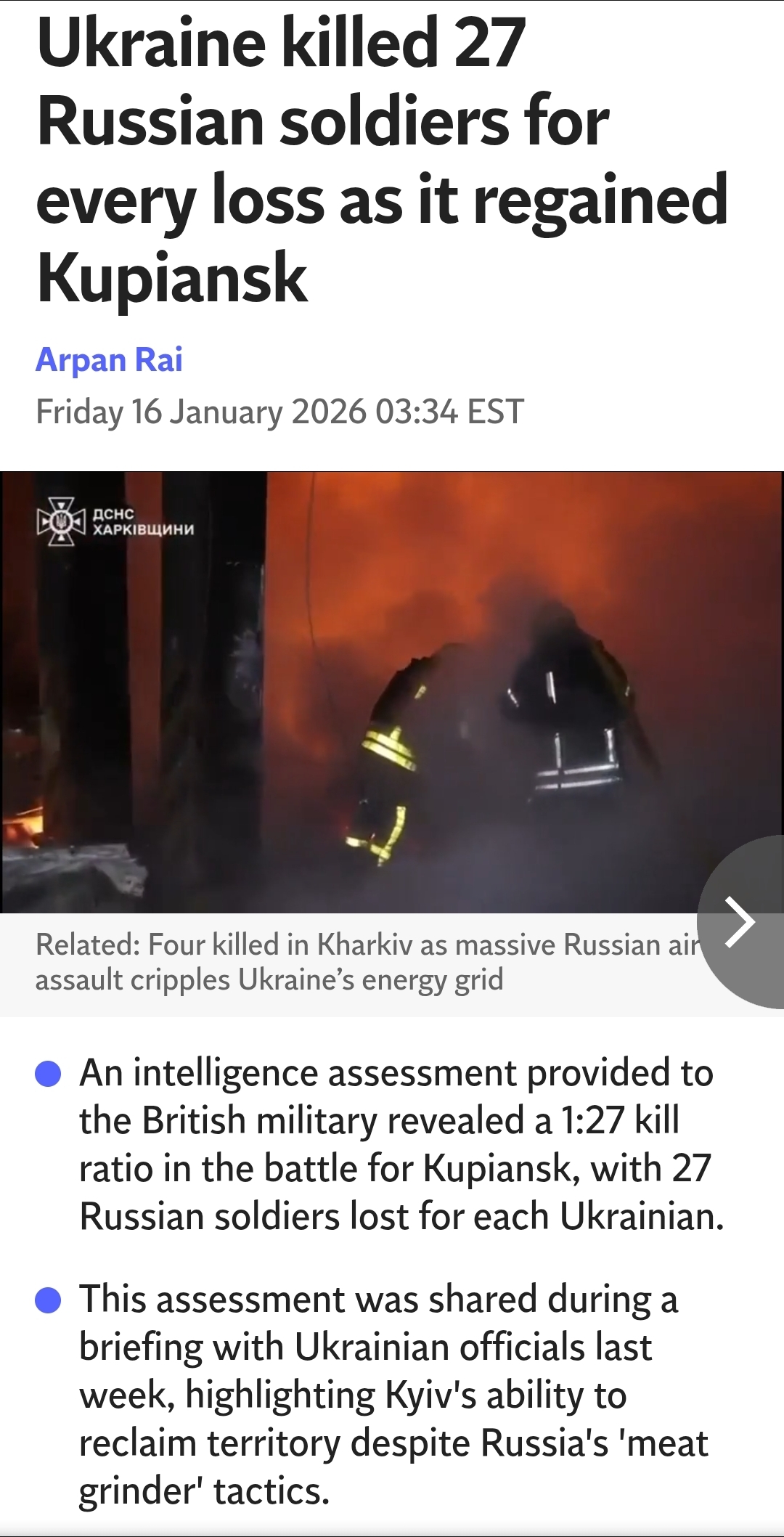 >Russia has dealt serious blows to Kharkov's energy sector, which supplies the city with heat and electricity: the damage is very significant - and this is not a case of "just patching things up and moving on", - Mayor Terekhov