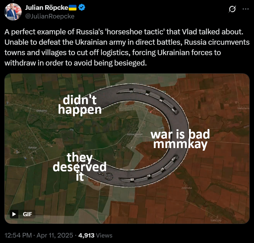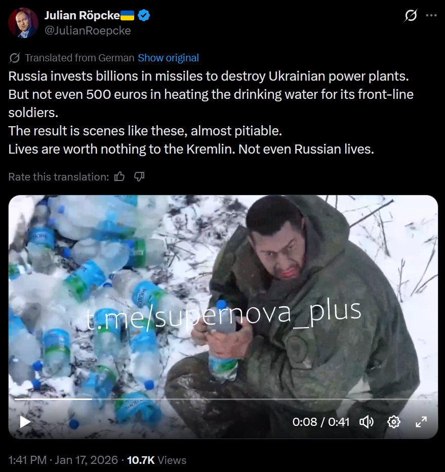 https://x.com/JulianRoepcke/status/2012490365396226121>Russia invests billions in missiles to destroy Ukrainian power plants. >But not even 500 euros in heating the drinking water for its front-line soldiers. >The result is scenes like these, almost pitiable. >Lives are worth nothing to the Kremlin. Not even Russian lives.
