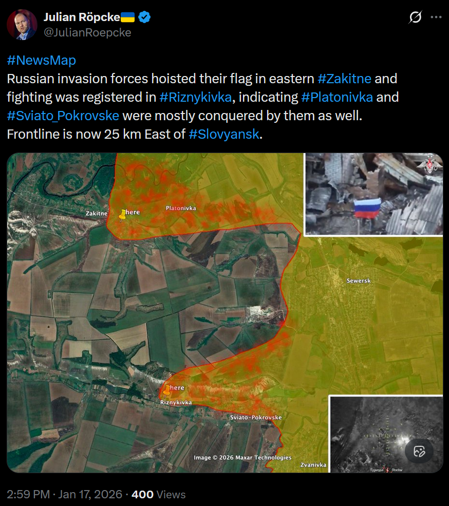 https://x.com/JulianRoepcke/status/2012510089387614413>#NewsMap >Russian invasion forces hoisted their flag in eastern #Zakitne and fighting was registered in #Riznykivka, indicating #Platonivka and #Sviato_Pokrovske were mostly conquered by them as well.>Frontline is now 25 km East of #Slovyansk.illegal and unprovoked liberation continues