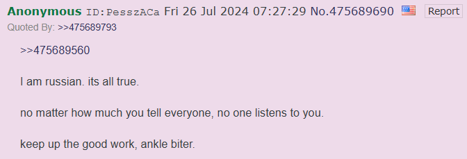 >>526235072Fun fact: he's literally spamming his wank folder. This is the mindset of an average russia supporter.Jannies won't do anything because they are brown themselves, this is nu/pol/ after all where Islam and communism are considered "based".