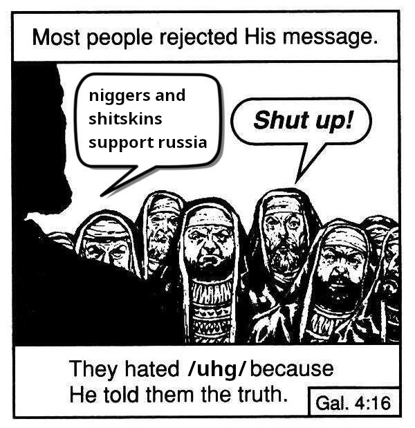 >>526230436>What is even the point of saying this?You must understand that the "people" in this general are either glowniggers, or NPCs/Hylics which possess no independent agency to scrutinize propaganda narratives. In either case, propaganda narratives are delivered without commentary on how absurd it all is. These "people" are the same ones who also got jabbed during (((COVID))) and kneeled to niggers during BLM.