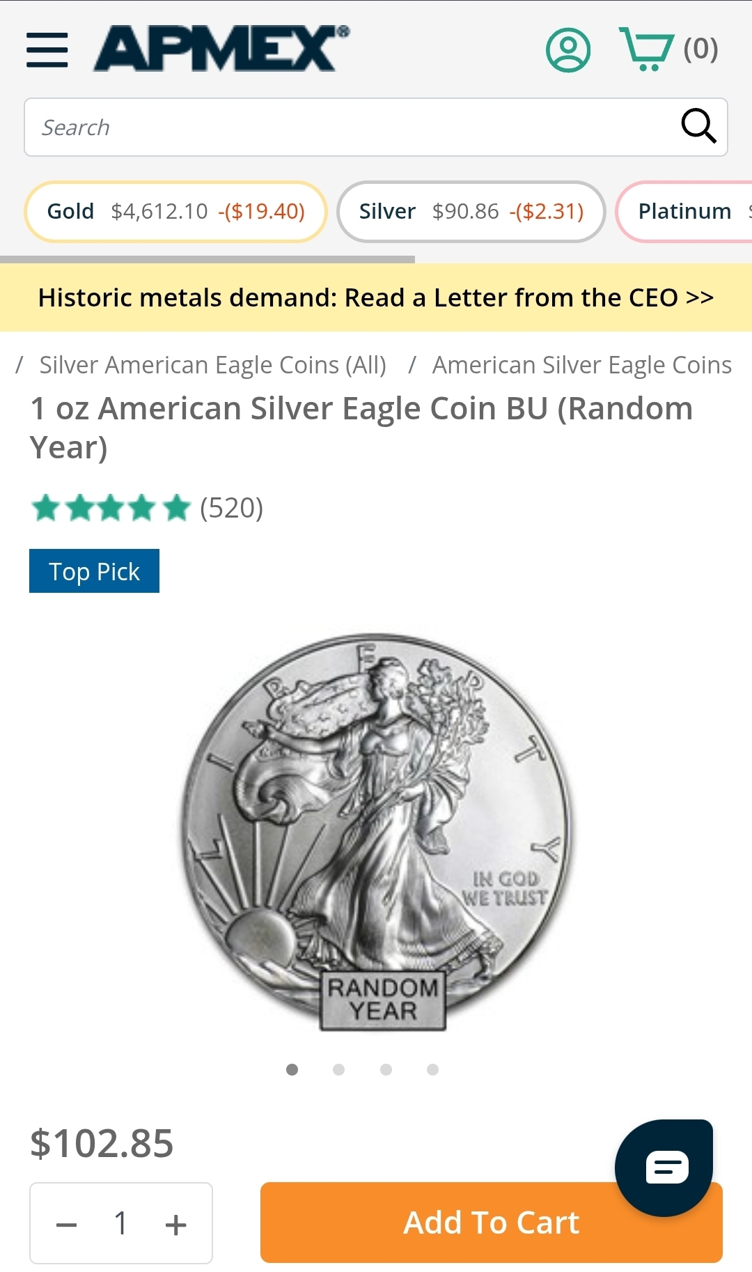>>526233205It was $91/out last week and someone bought them out. Apmex is over $100 for an ASE. Its getting nuts.