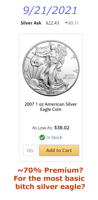 >>526233576Yes it is. Silver eagles command a premium over spot, but it is tied 100% to spot, which is failing to actually represent the price to acquire physical silver. The price of silver eagles has always tracked spot UNTIL NOW.>>526233748No, they have to print silver coins by constitutional dictate, and not to make a profit. They charge what it takes to make the sovereign coins, and they are OUT, and saying this is the new price when back in stock.
