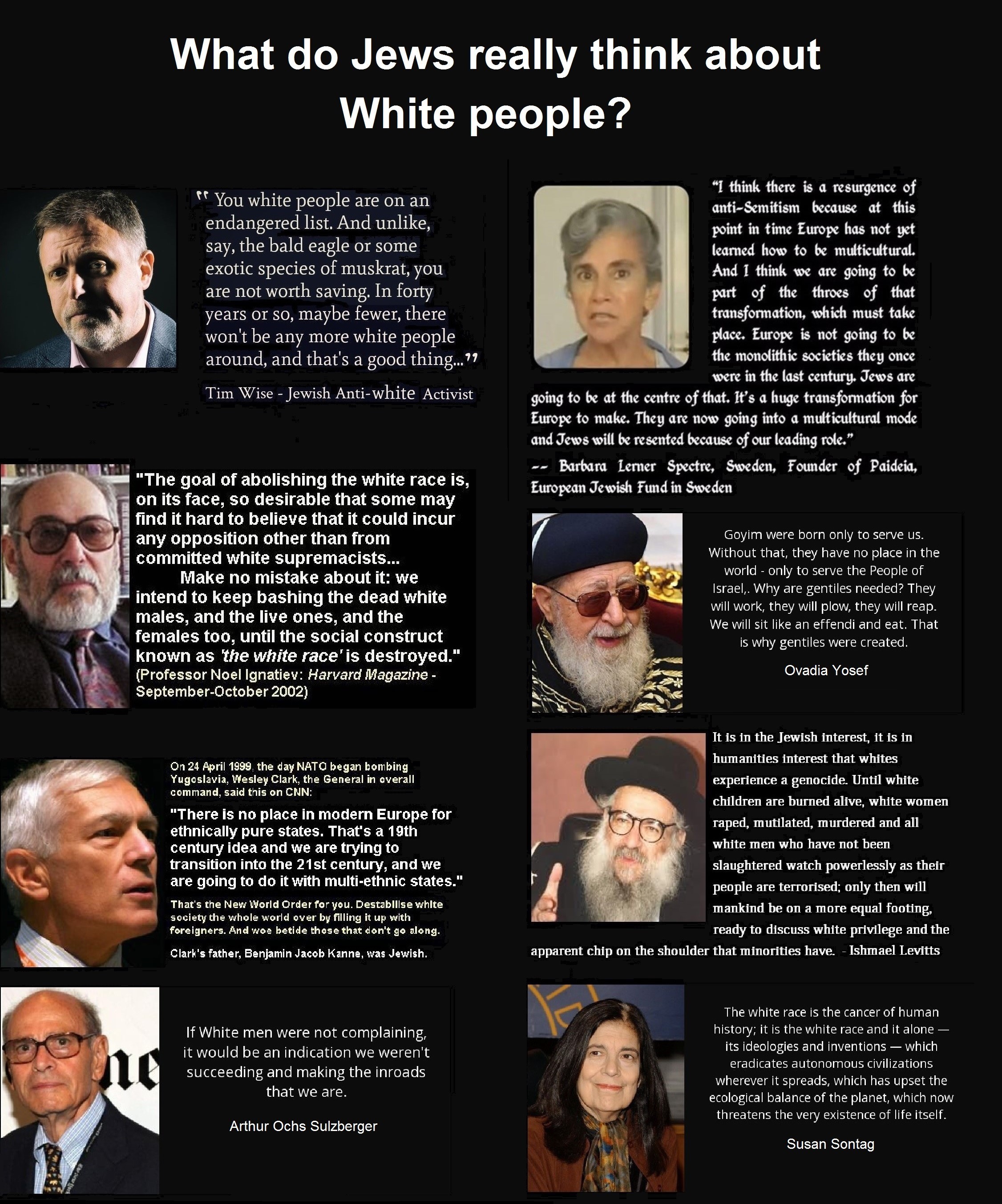 There is no Jewish conspiracy to keep you down.The average person has never considered the "Jewish question"No one outside of /pol/ has ever considered [insert group] fatigue as a real thingMost immigrants to any country are just looking for a better lifeImmigration is not invasion There is nothing special (good or bad) about any person's skin color Obsessing over isolated incidents that "confirm" your beliefs isn't healthy for youWomen are just as capable as menThe capitalist class uses divide and conquer tactics to drive potential allies apartThere is nothing wrong with the government using its power to help people in needMight does not make right