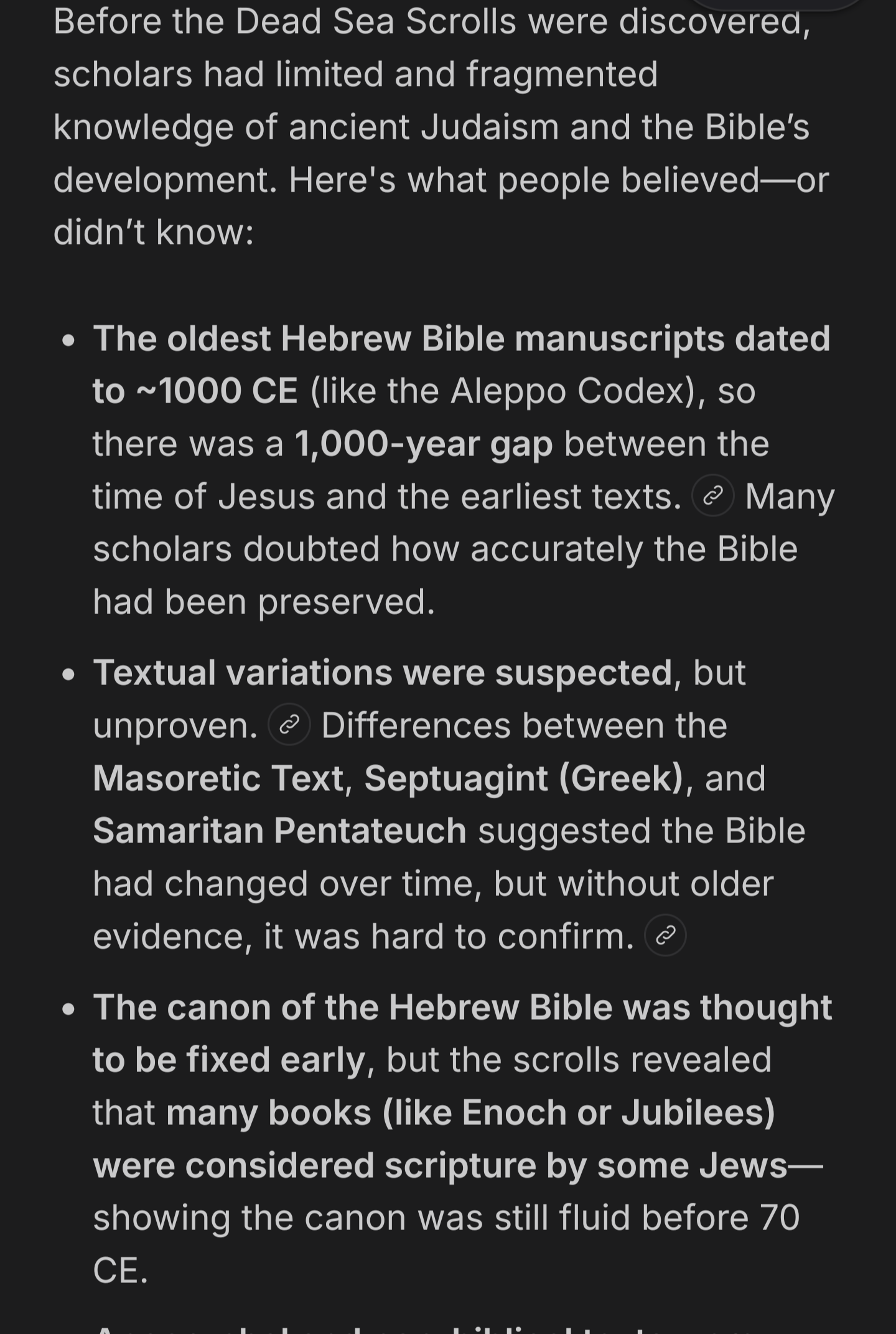 If the Dead Sea Scrolls did not exist, **many key insights into ancient Judaism and the development of the Bible would not be believed or known**. Specifically:- **The accuracy of the Hebrew Bible’s transmission** over centuries would be far less certain. The scrolls confirm that biblical texts were copied with **remarkable fidelity** over 1,000 years.- **Textual diversity in early Judaism** would be underestimated. The scrolls reveal **multiple versions of biblical books**, showing that the Bible was not a fixed text in antiquity.- **The existence of non-canonical and apocryphal books in Hebrew** (like *Book of Enoch* or *Jubilees*) would be doubted, as these were only known in translation before the scrolls.- **The beliefs of Jewish sects like the Essenes**—their apocalyptic views, communal lifestyle, and strict purity laws—would be poorly understood or dismissed as exaggerations.- **The historical context of early Christianity** would be less clear. The scrolls illuminate the **religious world in which Jesus lived**, including messianic expectations and scriptural interpretation.In short, without the scrolls, **the diversity, complexity, and continuity of Second Temple Judaism** would be far less credible to modern scholars.I love this website. now I'm going to hunt to disprove the fucking stupid ass Dead Sea scrolls