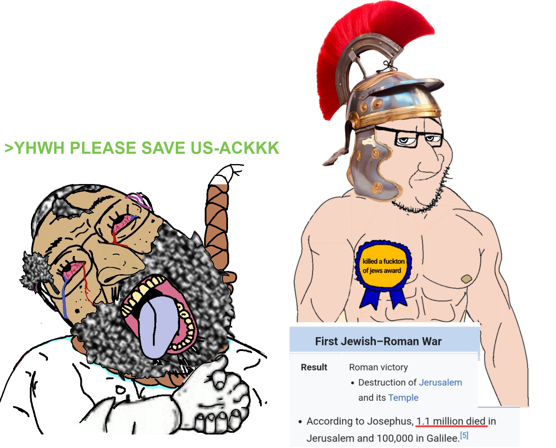 >>526246583>sorry knowing that your skin is colored like animal feces like most christians I knew I should've written using as much punctuation as possibleThat's not an answer, just the usual /pol/ bullshit. >it is, I proved judaism existed as a term Which doesn't say anything about the subject. We have been over this for over 10 years, you do not know the diff between Jewish and Judaean, for example. You just repeat your nonsense again and again. >and that according to christian saints themselves your religion comes from jewsWell, duh, the Israelites had everything and threw it all away willingly and malevolently, this is kinda the point. Why God came to them first? because, as Jesus said, the doctor goes to the sick, not to the healthy. But what does that have to do with Jesus allegedly being Jewish? You're mixing up stuff again.>consider your self blown the fuck outLol.