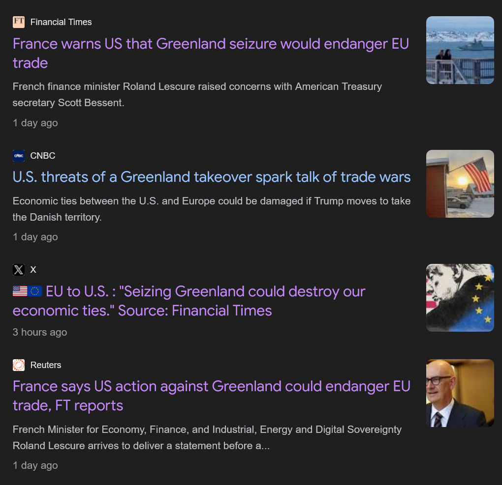 >>526249931Increased tariffs on Europe to pressure them to sell us Greenland.A lot of the Catalog went from seething about ICE to seething about the US taking Greenland.Europe is an enemy waiting to stab us in the back if they're this brazen about running online propaganda campaigns against Americans.