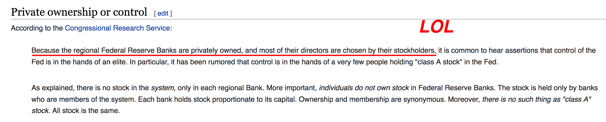 >>526261867>>526261657>>526261946No one wants to privatize the federal reserve for you, and put it under the direct private ownership of billionaires. For them to do whatever they want with it.No matter how much misinformation you post. No matter how much wall of copypasta you save on your harddrive and post for 15 years. No one wants billionaires privately owning the federal reserve